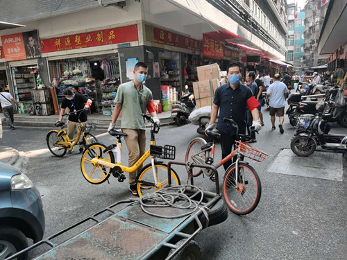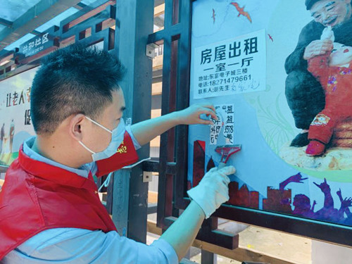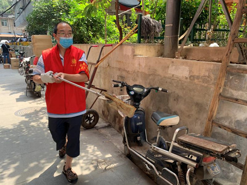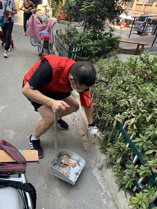大家深入社区进行志愿清扫,坚决不留卫生死角,用实际行动美化家园。社区中央露天长廊本为居民们提供了一个休闲娱乐的场所,但因共和社区商户和住户混杂,外来人口众多,长廊地面遍布烟头,花坛内部更是堆满垃圾,极大影响了社区文明形象。黄炜、王康双休日下沉,用铲子四处清除牛皮癣;张阳、蓝雷宇、杨威(小)顶着火辣辣的太阳,汗流浃背,一边清理垃圾,一边搬运乱停乱放的自行车;面对花坛里不易清扫的垃圾,工具使不上劲儿,张灿甚至用手将塑料袋、饮料罐、烟盒等垃圾一个个地捡出来;王倩巾帼不让须眉,仔细清扫垃圾之余,还承担了劳动宣传的任务。