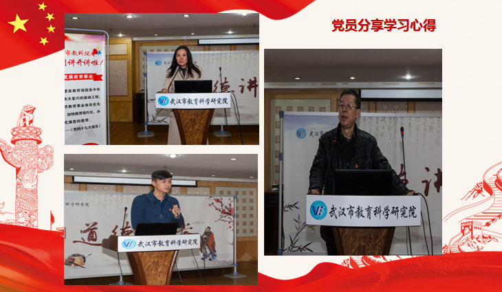 在道德讲堂环节,全院党员干部、教职工齐唱了歌曲《我们走在大路上》,认真观看了全国优秀共产党员黄大年无愧于时代的奋斗故事教育片,聆听了中学教研室孔峰老师教书育人、心系苍生的故事。在周周讲环节,党员代表杨威老师诵读了党章,全体党员干部聆听了中学教研室韩富军老师主讲的党课《研教育方针,筑强国之梦》,认真学习了党的教育方针和全国教育大会精神,并现场撰写心得感言。其间,党员代表陈道红、沈琪和蓝雷宇分别交流了学习感悟,中学教研室党支部书记华林飞对周周讲活动进行了全面讲评。