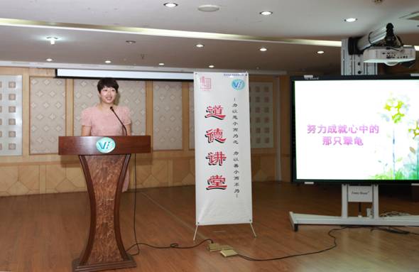 活动的高潮是讲故事环节。在我院职业教育与成人教育教学研究室范忻书记《助职教出彩让群众满意》的故事讲述中,我们看到了一群敬业爱岗、追求卓越的职业教育工作者,他们树立了良好的职业道德和职教形象;在我院中学教学研究室吴明好老师的《仰望星空 脚踏实地》的故事中,我们感受到一名教科研工作者的责任与担当,他的“为师之学,为师之师,为师之友”感染和鼓舞了在座的每一位;在我院团支部书记、现代教育技术中心吴振涛老师的《努力成就心中的那只犟龟》里,我们看到了一位崇尚创新、充满活力的年轻教育人。三位老师讲述的故事,让大家的灵魂又一次受到了道德的洗礼。