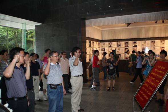 在井冈山革命烈士陵园,学习体验团代表院党委向革命先烈敬献了花圈,缅怀先烈的丰功伟绩。委员代表列队前行,步履坚定、神情肃穆,表达了对先烈们崇高的敬意。在纪念大厅,面对鲜艳的党旗,党员们在李书记的带领下,庄严地高举右手并握拳,重温入党誓词。铿锵恢宏的誓词,久久激荡在每位党员的心中,增强了作为一名共产党员的荣誉感、责任感和使命感。党员们纷纷表示:要一以贯之地以实际行动去恪守对党的承诺,更加坚定实现共产主义的远大理想和建设中国特色社会主义的坚定信念。党外代表、教育信息资源中心副主任刘晓鸣深深感受到我院党建工作的创新性,他说:“虽然多次见证过共产党员宣誓,但今天给我的感觉非同一般,大家的拳头握得紧紧的,信心满满的,倍受震撼。”