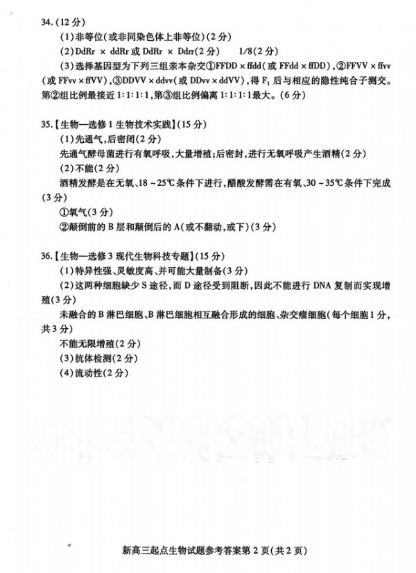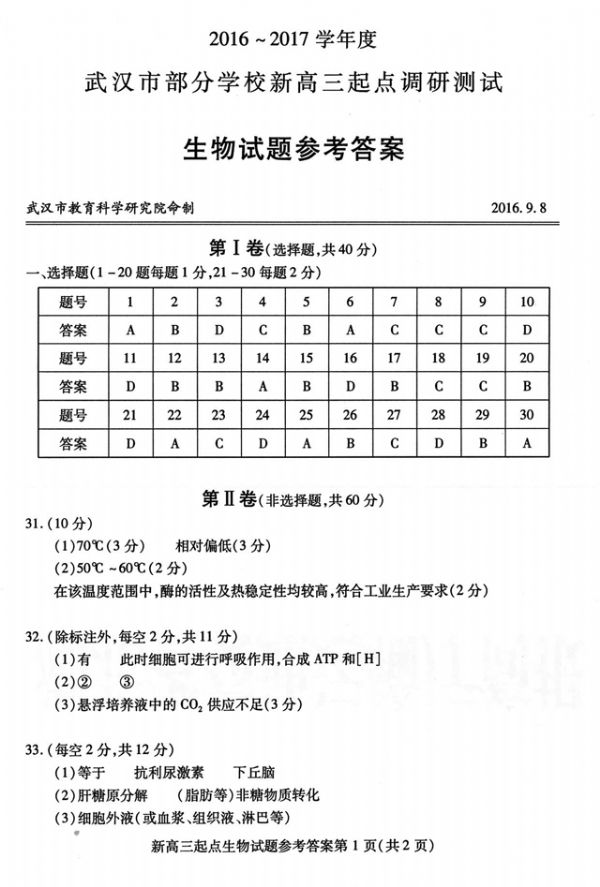 2016-2017学年度武汉市部分学校新高三起点调研考试生物试题参考答案及评分细则