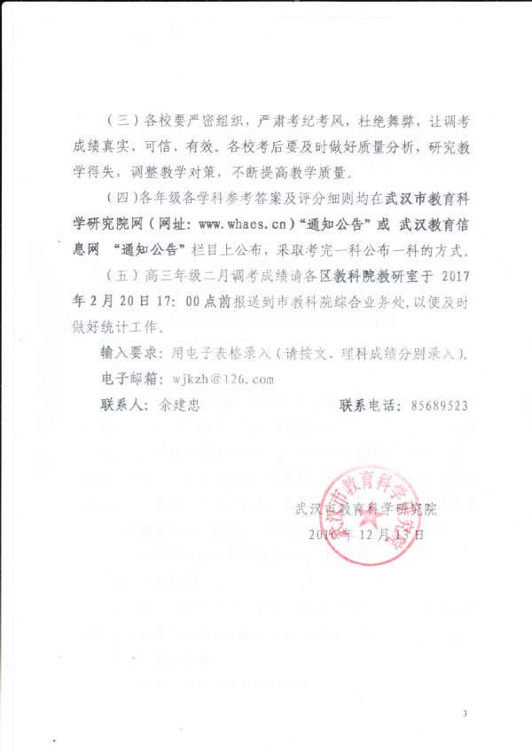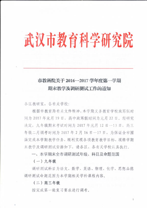 赢乐lV关于2016-2017学年度第一学期期末教学及调研测试工作的通知