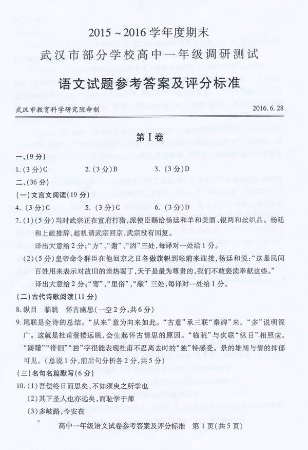 下一条:2015-2016学年度期末武汉市部分学校高中二年级调研测试语文试题参考答案及评分细则