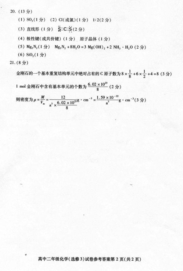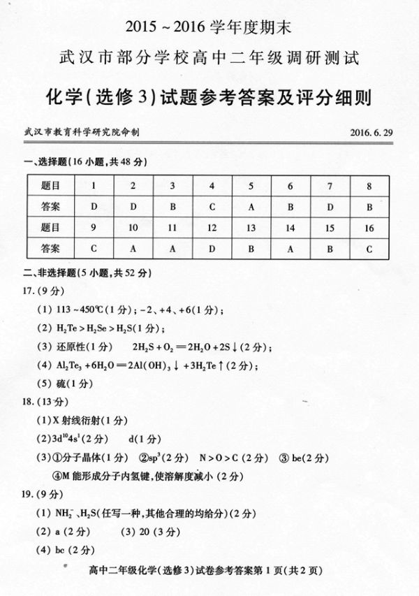 2015-2016学年度期末武汉市部分学校高中二年级调研测试化学试题参考答案及评分细则