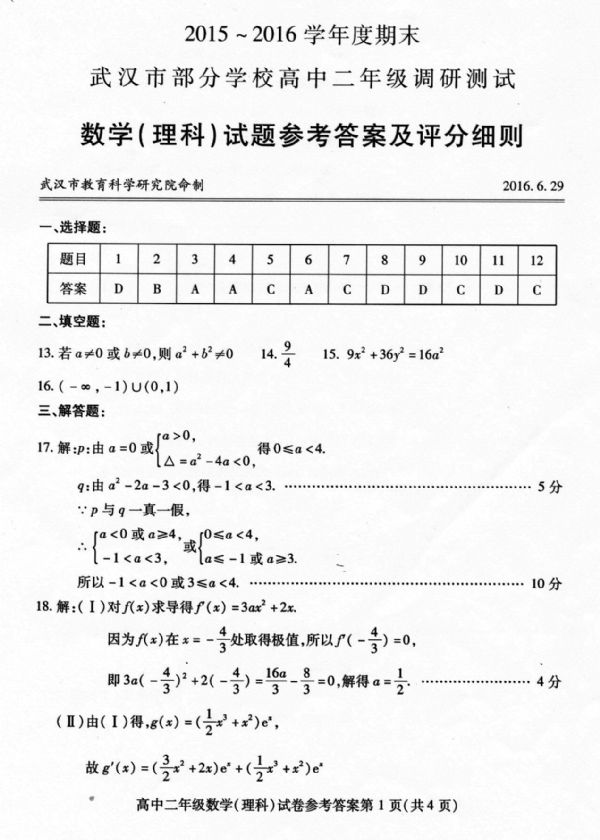 下一条:2015-2016学年度期末武汉市部分学校高中二年级调研测试数学(文科)试题参考答案及评分细则
