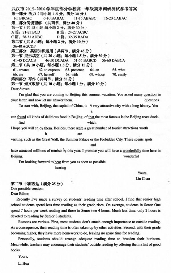 下一条:2015-2016学年度期末武汉市部分学校高中二年级调研测试英语试题参考答案及评分细则