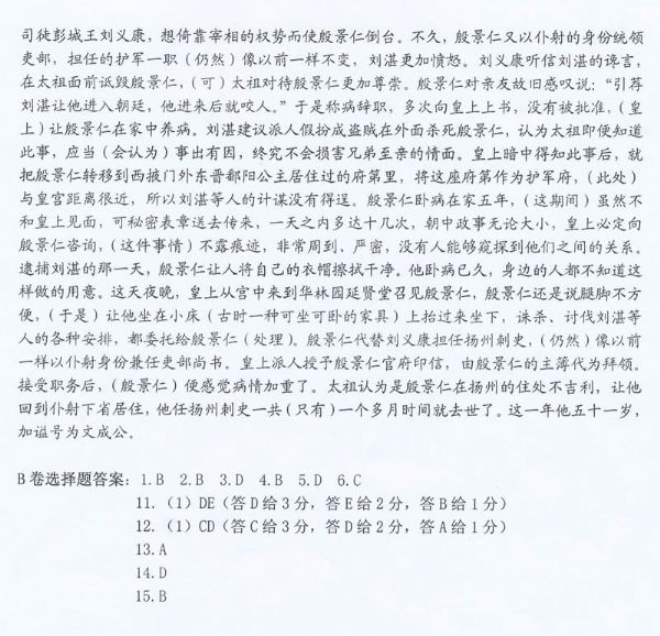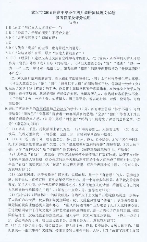 武汉市2016届高中毕业生四月调研测试语文试题参考答案及评分细则