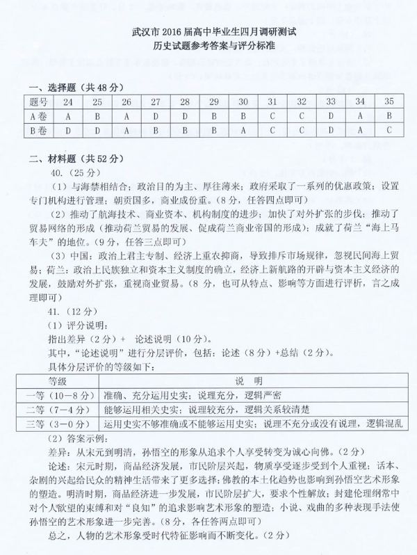 武汉市2016届高中毕业生四月调研测试文科综合历史试题参考答案及评分细则