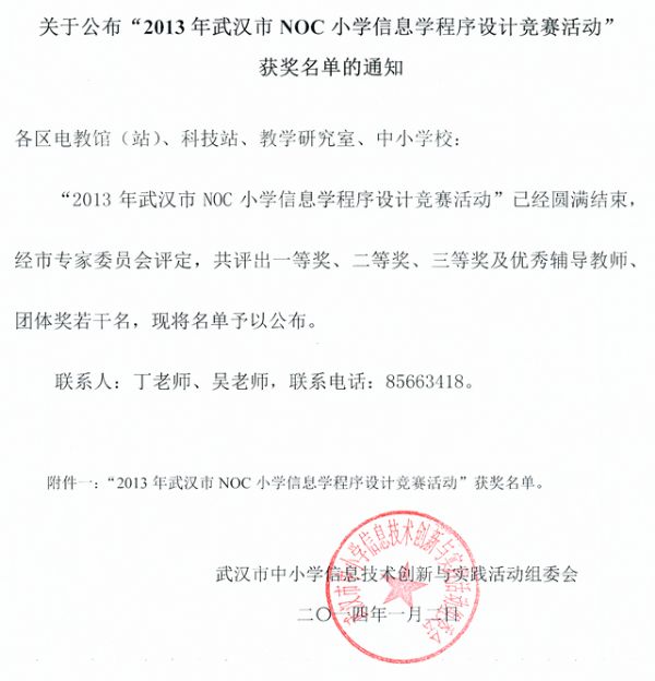 附件一:“2013年武汉市NOC小学信息学程序设计竞赛活动”获奖名单