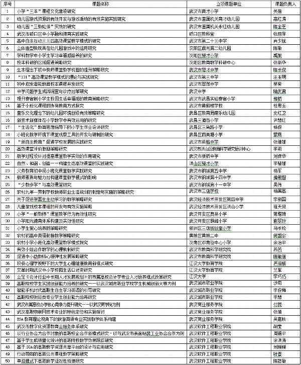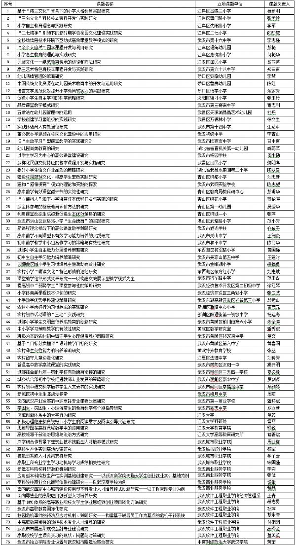 根据武教办[2011]30号有关文件精神,武汉市教育科学规划领导小组办公室组织有关专家,对各单位申报的2013年度武汉市教育科学“十二五”规划课题进行立项评审。经武汉市教育科学规划领导小组审定,《小学“三本”课程文化建设研究》等130项课题被确立为武汉市2013年度教育科学规划课题,现予以公示。