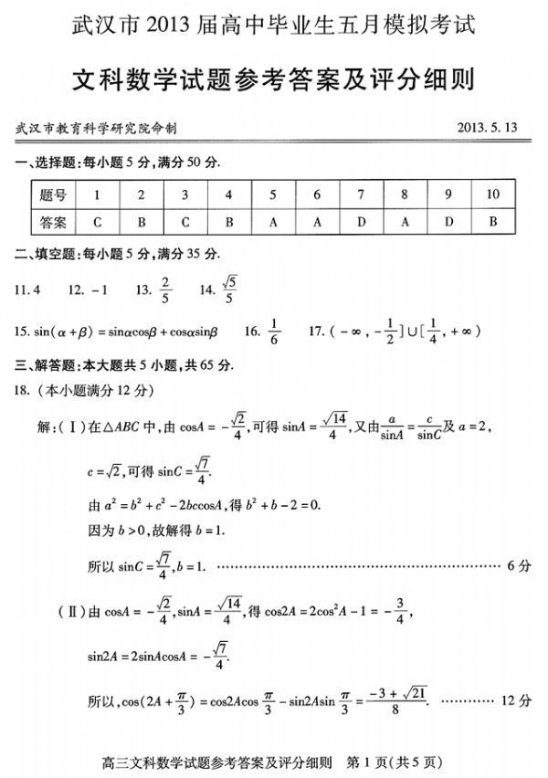 下一条:武汉市2013届高中毕业生五月模拟考试理科数学参考答案及评分细则