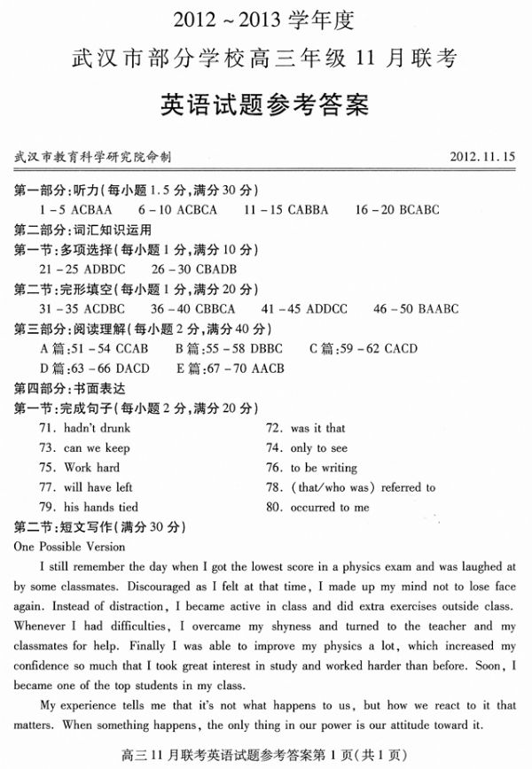 上一条:2012--2013学年度武汉市部分学校高三年级11月联考生物参考答案