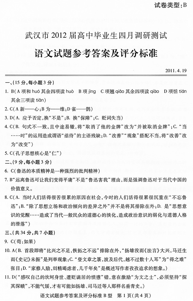高三语文4月调考答案评分标准B
