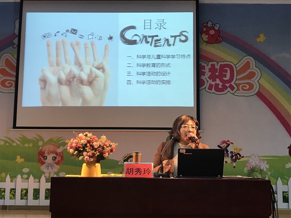 胡老师的讲座紧扣一线教师们的教学实践,细致、详细、清晰地让教师们不仅理解了科学探究活动的理论知识,还能从身边的点滴教学、优秀事例中来学习和牵引,受益匪浅。让教师们明白:应追随幼儿的学习兴趣,从幼儿生活中寻找科学教育的素材,经过精心巧妙的设计,让幼儿在自主操作科学学习材料的过程中,领悟有趣的科学知识,获得科学探究的能力。