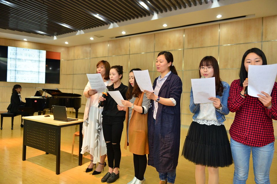 而刘玉琦老师则从声乐、钢琴及理论常识三个方面向在座的音乐老师提供了宝贵的经验和建议,从赛前准备,选择作品,聘请专家,到每日训练计划,逐一展示给大家,令许多没有参与过此赛事的老师们有了充分的感性认识,不再茫然。刘老师还特别强调,老师们要注重日常的积累,功夫在平时,要广泛阅读,关注从小学到高中的18册教材、教参,知识的积累来不得半点虚假……两位老师的精彩分享获得了在场老师的阵阵掌声,会场气氛活跃,人人积极参与,现场还进行了合唱训练,而奖品就是刘玉琦老师主编、华科附小音乐教师团队共同打造的专著音乐游戏书《音乐让我们在一起》!胡晓燕老师对此高度肯定,并在活动结束时对全市音乐老师进行了大力推介!