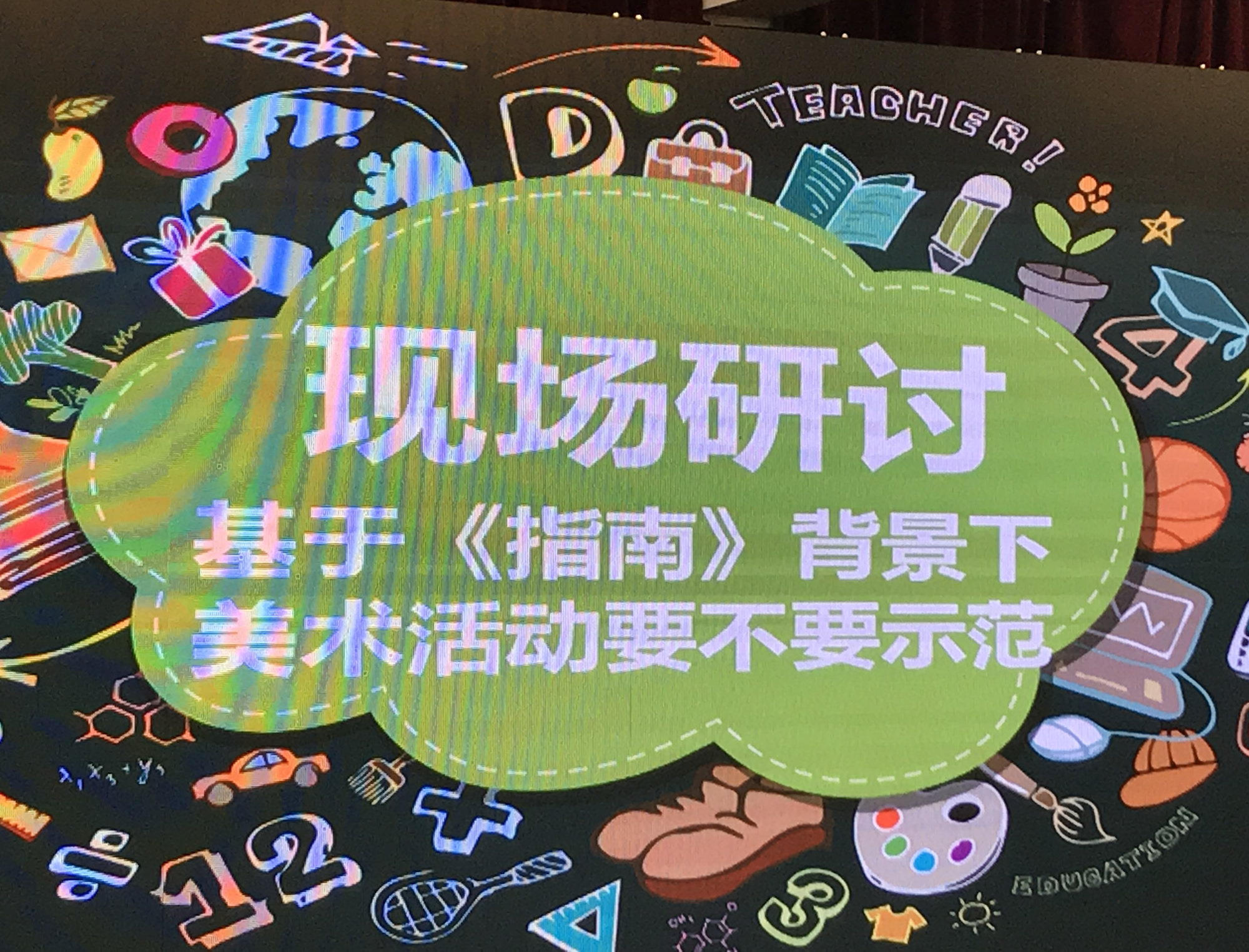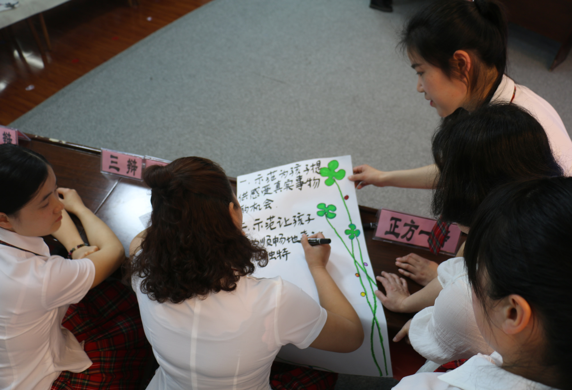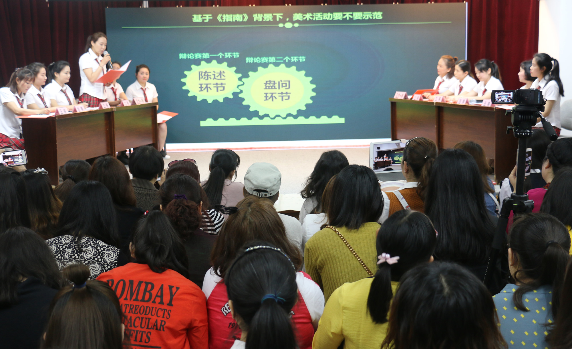 第三个环节是由永红幼儿园朱秀兰老师执教的艺术活动《杨柳紫藤春燕图》,在活动中朱老师通过水墨画,让幼儿在笔墨游戏中接触和感受了中国传统艺术的精髓,培养了幼儿对国画艺术的兴趣和爱好,更让孩子自学习水墨画的同时从中了解和继承了中华民族的文化遗产,萌发了孩子们热爱中古传统艺术、热爱生活的情感。 第四个环节是由永红幼儿园教研组的老师们进行的现场教研活动展示,现场教研活动以辩论的形式来进行,主题为“基于《指南》背景下,美术活动中要不要示范”。在现场教研活动中,老师们通过采访幼儿视频、采访家长视频、幼儿活动课例以及现场互动实验等多种形式,老师们之间的观点进行了激烈的碰撞,将“示范”的范围和含义进行了深层次的挖掘。既要注重幼儿的自主创新,又要适时适宜的进行引导,因此,只有幼儿的自主创新和教师引导形成一个动态的平衡,幼儿美术活动才能成为培养其自主创新能力发展的最佳载体。 最后,严园长对本次活动进行了专业引领,让教师在观念上又有了进一步的更新和提升。