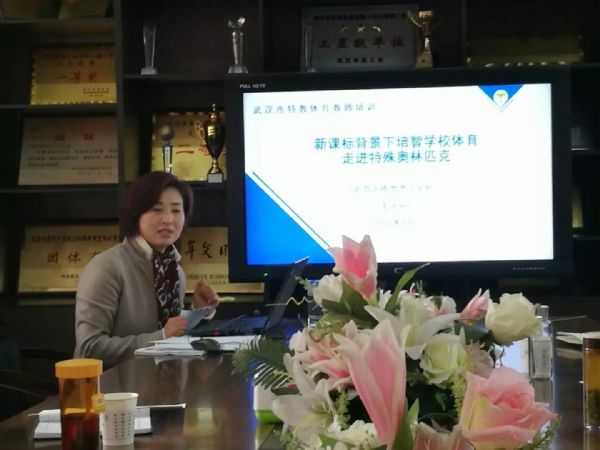 2017年3月7日,在武汉市武昌区培智中心学校进行了一场题为《如何在培智课程标准指导下开展特殊奥林匹克体育运动》的专题培训。参训的主要领导有武汉市专委会文洁理事长、学术委员会顾问齐玲老师、常务理事武昌区培智中心学校王霞校长、常务理事江夏区特殊教育学校王桂梅校长、江岸区辅读学校吴梅书记、武汉市专委会孟玥秘书长、副秘书长张晓雯,以及武汉市各特教学校的分管领导和体育骨干教师。