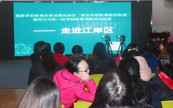 (通讯员 何丽平)2017年3月22日上午,国家学前教育改革发展实验区“健全学前教育教研制度”暨武汉市新一轮学前教育保教实验下园视导走进江岸区实验幼儿园。赢乐lV张敏、江岸区教育局副局长黄运萍、初教科徐莉科长、江岸区小学教研室尹力老师以及来自武钢幼教中心、洪山区、青山区、黄陂区、新洲区、江汉区、江岸区的教研员、园长、老师们共计180余人参加了本次活动。