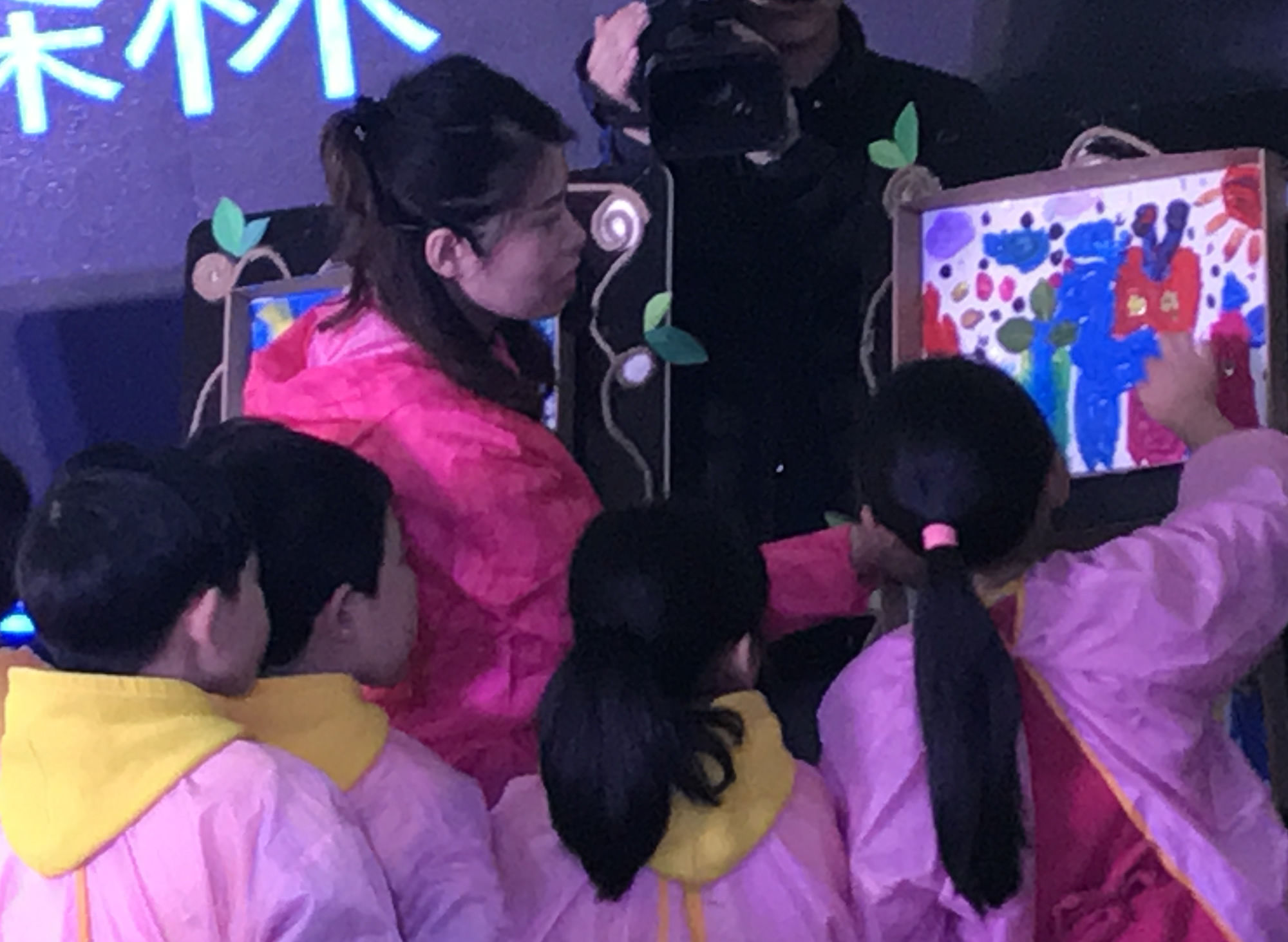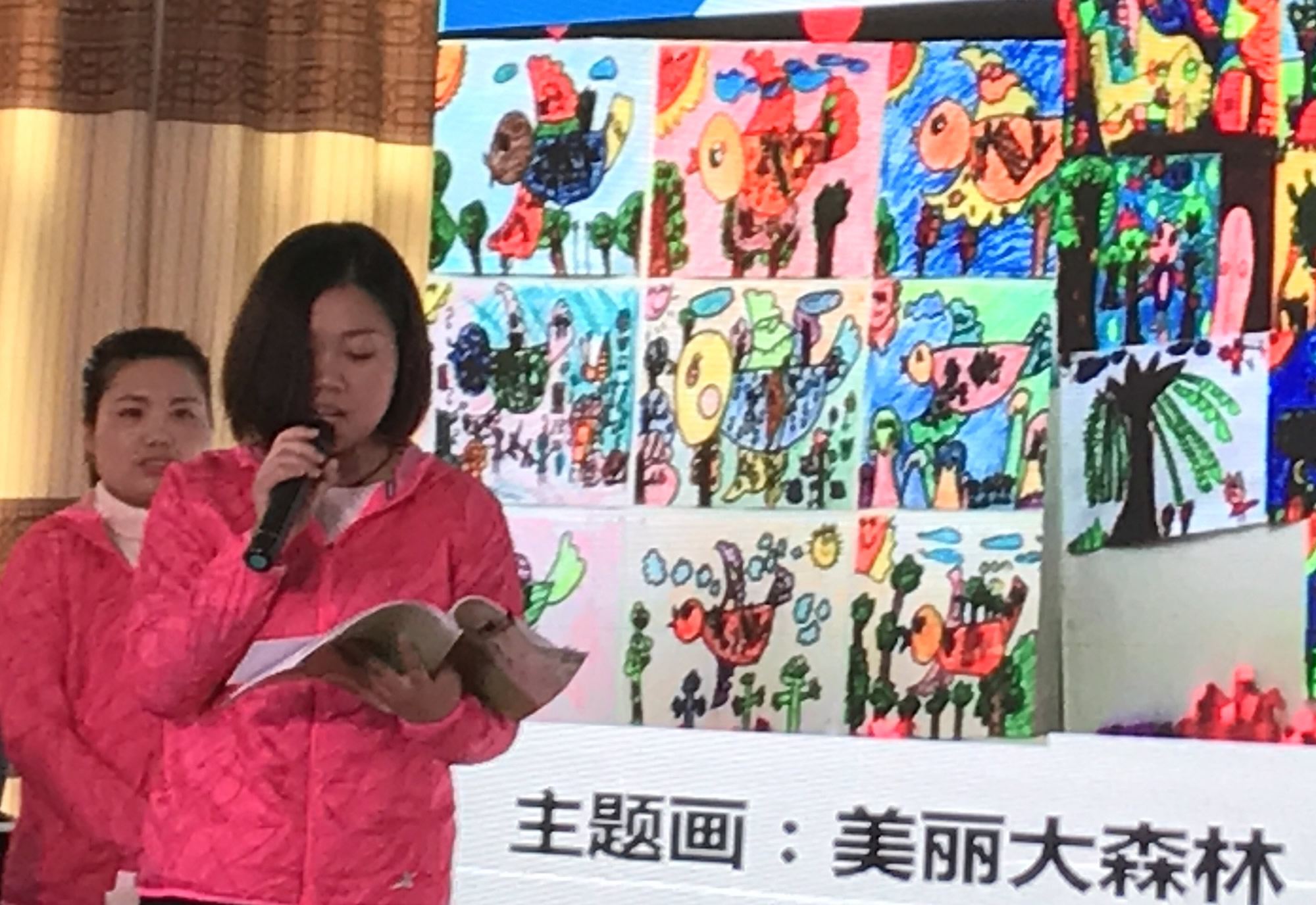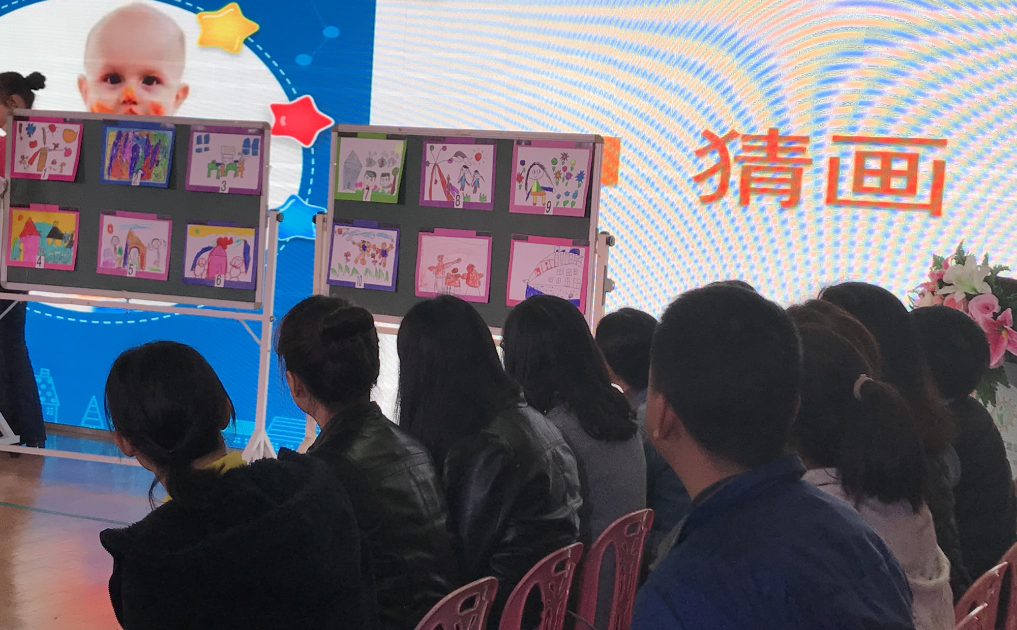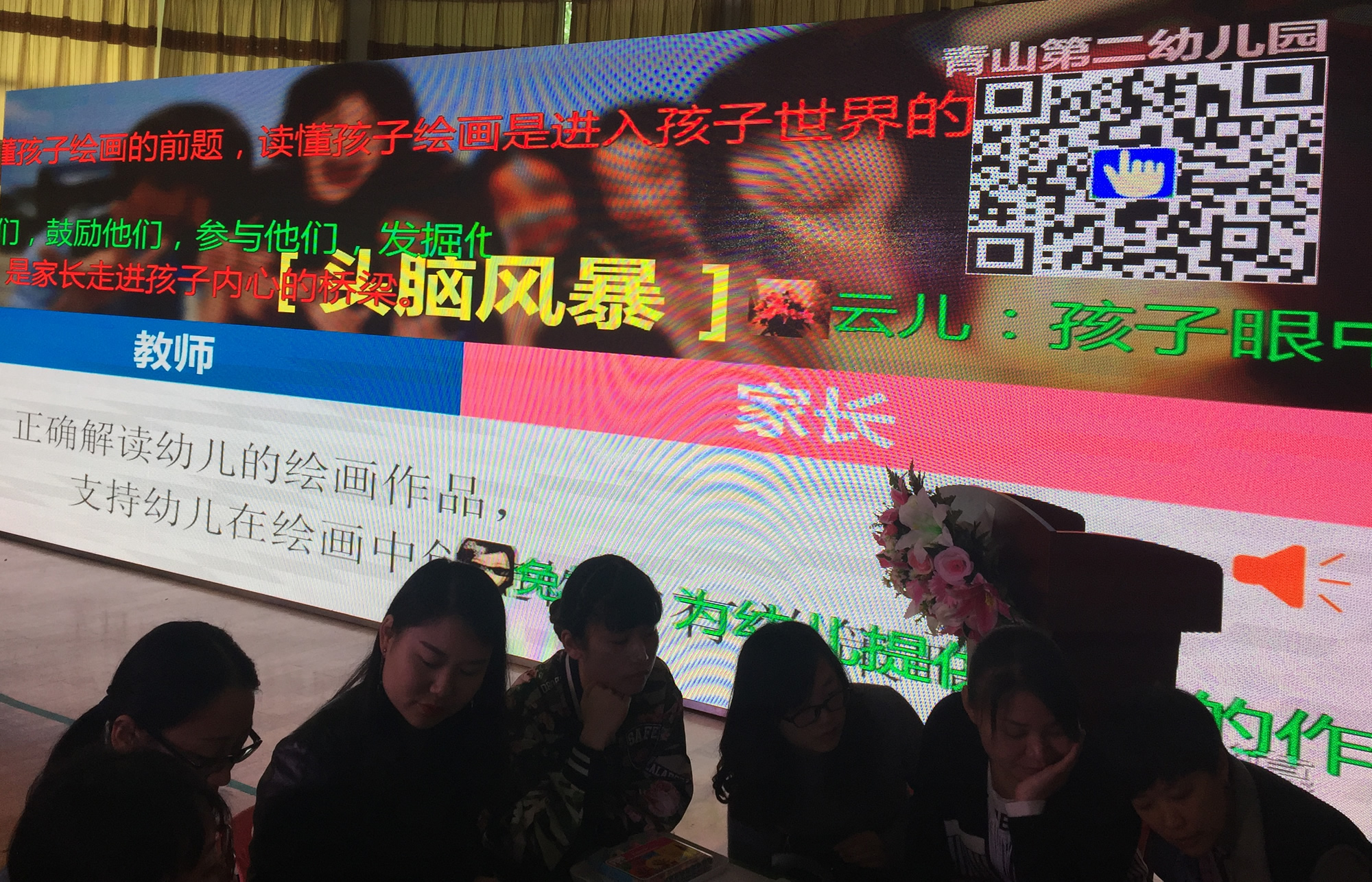 第三个环节是由青山区幼儿园社会性教育片区联动教研展示活动,青山区社会性教育片区联动教研组共有十所幼儿园,其中有示范园、一级园、二级园和未评等级的幼儿园共10所,参与现场研讨的教师共15位,本次活动还邀请了青山区第二幼儿园中班组的家长代表参与。为了更好的寻找研讨的切入点,活动前期核心园青山二幼组织片区内1008位家长开展了“家长对儿童画的认识与指导现状调查问卷”。另外,为了了解各园所教师常规教学效果和幼儿绘画情况,结合艺术领域展示活动《奇幻森林》,我们在10所幼儿园的大班开展了常规的绘画活动“美丽的森林”。通过前期在前期进行了对家长、教师和幼儿的调查问卷及常规教学的摸底,确定活动以“读童画—— 正确解读幼儿的绘画作品,支持幼儿在绘画中的创造性”为主题,活动分为三个环节:“读你”千遍不厌倦——发现问题、聚焦热点;“懂你”的感觉像春天——解决问题、寻找方法;“信你”的童话似诗篇——拓展经验,提升理念。家长和老师们通过“猜画”“读画”“画太阳”“头脑风暴弹幕互动”等有趣的游戏、激烈的脑力激荡,在主持人贺琳和朱玲老师的引导下,深入的探索、学习,帮助教师和家长正确的认识幼儿绘画发展的特点,建立支持幼儿在绘画中创造性的有效策略和提升,教师和家长对幼儿绘画作品的解读及评价能力。