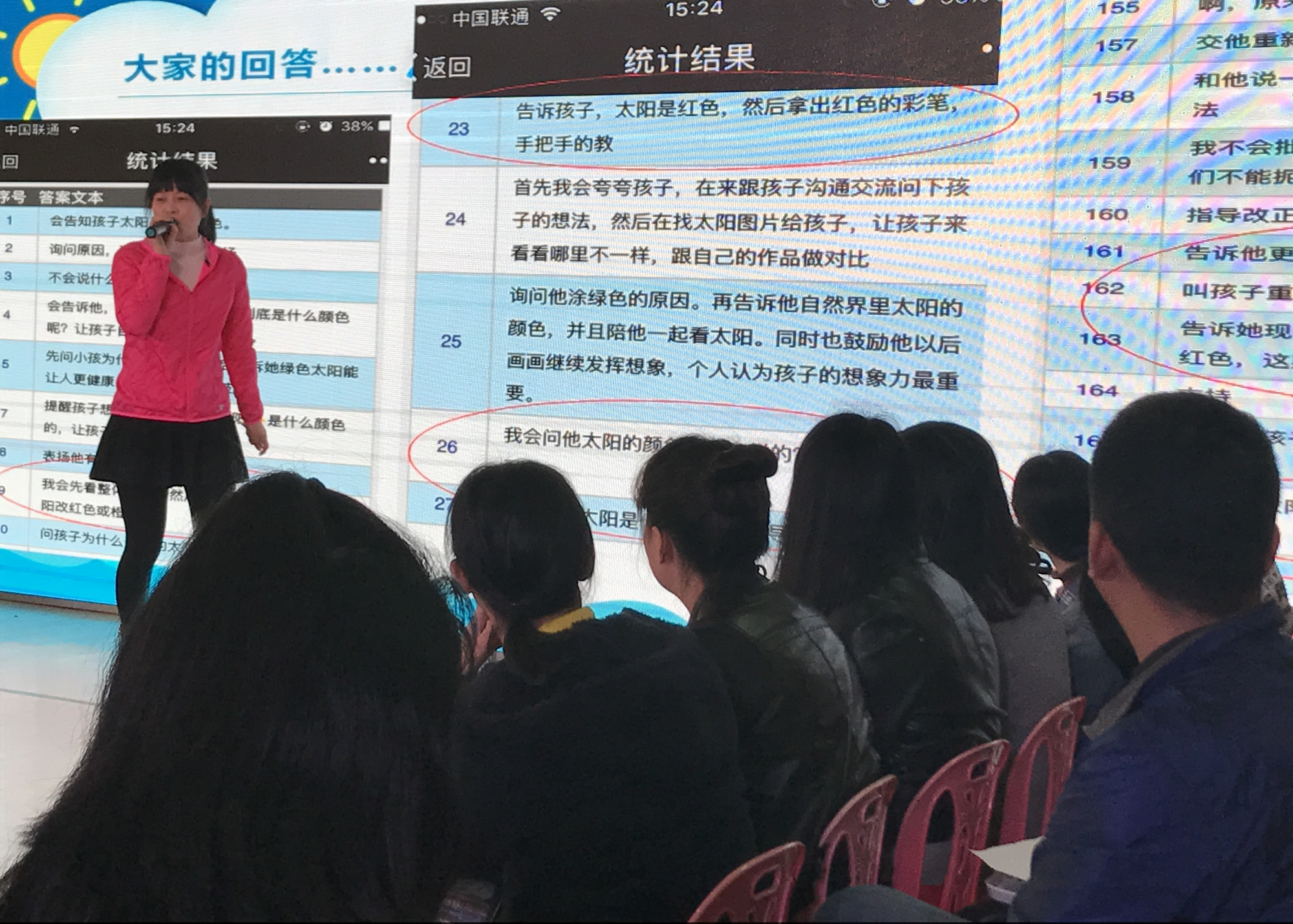 本次活动融入了一些趣味的网络互动手段,利用弹幕,把参加活动老师们的想法通过手机发送到大屏幕上,让现场所有的老师都能亲自参与到活动中去。活动后,全体参研教师通过扫码登录“问卷星”填写教研活动评价反馈表,以了解活动的实效性,整个活动轻松、活泼、有趣。活动后张敏主任就青山区片区联动教研制度的建设和实施以及教研活动的深度、广度和效度给予了充分的肯定,各区教研员也分别对经验分享、教研活动和教学活动进行了精彩点评。经过专家的精心梳理,本次活动定能成为青山区片区联动教研组前进的又一次推波助澜,在片区教研机制的推动下,青山幼教的明天将会百花齐放、春色满园。