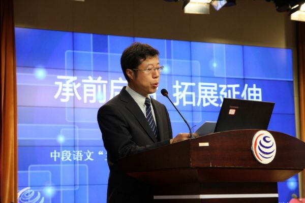 常青实验小学徐辉主任的发言以《“主动教育”高效课堂教学模式的探索》为题,介绍了模式的提出及探索历程、模式的实践操作、模式的深入推进与变式研究。重点结合该校中段阅读教学模式(感-探-议-品-练)的具体操作,阐述了该模式研究的不断深化。