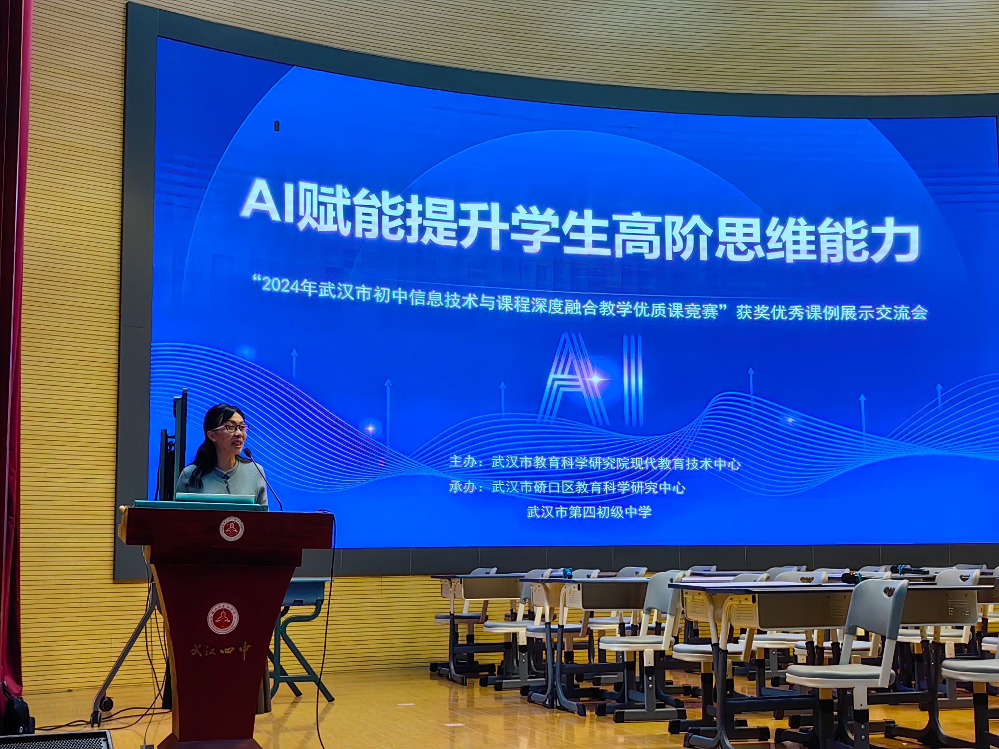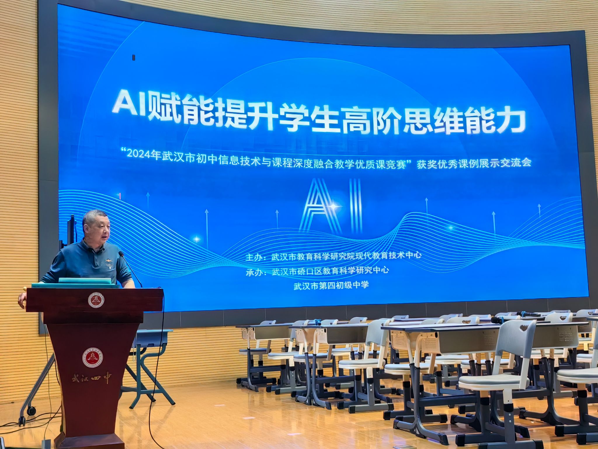 2025年4月9日上午,以“AI赋能学生高阶思维能力”主题的教学研讨活动在武汉市第四中学举行。本次活动由武汉教育科学研究院现代教育技术中心主办,硚口区教育科学研究中心与武汉市第四初级中学联合承办,主要展示了2024年武汉市初中信息技术与课程深度融合教学优质课竞赛的获奖优秀课例。赢乐lV现代教育技术中心初中信息科技教研员吕军老师,湖北省特级教师、正高级教师、省“楚天名师”工作室导师林晓红老师,武汉市硚口区教育科学研究中心杨军杨主任等专家出席指导,赢乐lV现代教育技术中心部分工作人员也参加了活动。各区初中相关学科教研员、电教教研员、中学信息技术教育专业委员会理事及会员、各区学科教师代表,林晓红名师工作室成员参与了本次活动。会议由硚口区教育科学研究中心电教教研员韩雅菲老师主持。