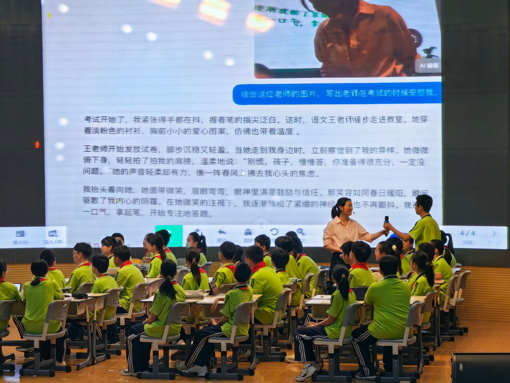 在韩老师热情洋溢的欢迎致辞之后,武汉市第四初级中学的王静老师携手七(8)班的同学们,以饱满的精神状态开启了一场语文课堂教学AI探索之旅。王静老师充分发挥人工智能技术优势,带领学生借助AI评析作文、自主修改作文,并组织学生对AI修改结果进行点评。层层递进的教学环节,不仅让学生切实体会到AI技术在写作中的应用,更引导学生用辩证思维看待AI生成的内容。整个课堂学生参与度极高,实现了以学生为主体的教学理念。