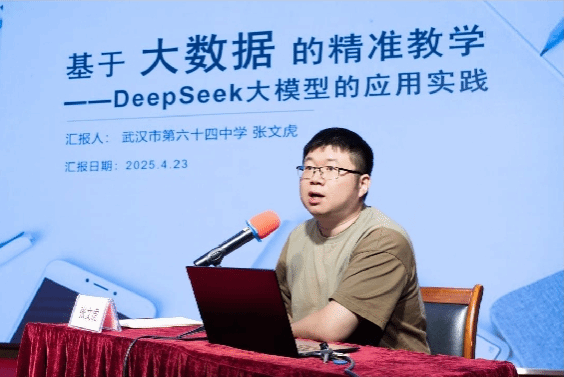 研修活动中,大模型应用示范种子教师、武汉市第六十四中学教导处主任张文虎进行主题为《基于大数据的精准教学——DeepSeek大模型的应用实践》的典型案例分享。张文虎结合武汉教育云平台提供的DeepSeek作业助手,分享大模型支持下的作业批阅、个性化试题生成与推送的典型案例,以及学生应用大模型进行苏格拉底式提问学习物理知识讲解、生成html格式的完形填空互动工具理解背诵英语单词等学生视角的创新应用。这些创造性的大模型教学应用方式给研修教师很大启发。