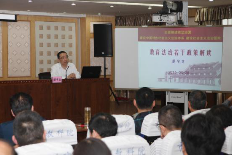 彭宇文教授的报告重点讲了3个方面的内容。一是从十八届三中全会《中共中央关于全面深化改革若干重大问题的决定》中“全面深化改革的总目标是完善和发展中国特色社会主义制度,推进国家治理体系和治理能力现代化。”入手,介绍了当前我国全面推进依法治国、建设中国特色社会主义法治体系、建设社会主义法治国家的战略部署,对《决定》提出的形成五个“体系”——完备的法律规范体系、高效的法治实施体系、严密的法治监督体系、有力的法治保障体系、完善的党内法规体系和两个“三位一体”——“坚持依法治国、依法执政、依法行政共同推进”、“坚持法治国家、法治政府、法治社会一体建设”进行了介绍。二是介绍了我国“七五”普法中的7个重点内容,包括:深入学习宣传习近平总书记关于全面依法治国的重要论述,宣传党中央关于全面依法治国的重要部署,使全社会了解和掌握全面依法治国的目标任务和总体要求;突出学习宣传宪法,把宪法学习宣传摆在首要位置,在全社会普遍开展宪法教育,提高全社会的宪法意识;深入宣传中国特色社会主义法律体系,把宣传以宪法为核心的中国特色社会主义法律体系作为法治宣传的基本任务,在传播法律知识的同时更加注重弘扬法治精神、培育法治理念、树立法治意识;深入宣传党内法规,突出宣传党章,大力宣传各项党内法规;推进社会主义法治文化建设,把法治文化纳入现代公共文化服务体系,推动法治文化与地方文化、行业文化、企业文化融合发展;推进多层次多领域依法治理,深化基层组织和部门、行业依法治理,深化法治城市、法治县(市、区)等法治创建活动;推进法治教育与道德教育相结合,大力弘扬社会主义核心价值观。三是解读了2016年教育部出台的《依法治教实施纲要(2016-2020)》,介绍了《纲要》的出台背景、指导思想、总体目标、基本原则和主要内容等。