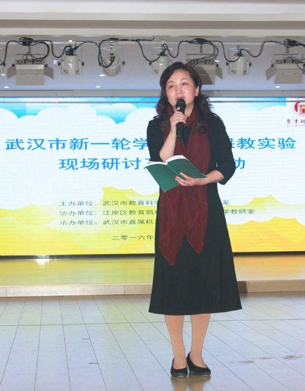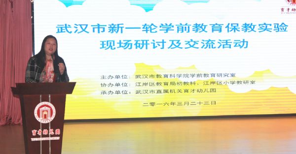 江岸区教育局初教科科长徐莉发表致辞,江岸区历年来十分重视教科研活动的开展,作为湖北省级学前教育示范先进区,先后承接了两大国家级科研课题研究《健全和完善教研制度》、《贯彻落实3-6岁儿童学习与发展指南研究》。徐科长对承接本次接待活动有着60多年历史的省、市级示范性幼儿园,市直属机关育才幼儿园给与了高度的评价和肯定。育才幼儿园一直以来,以开放的心态、毫无保留的分享和传递教育经验,在省市中起到了良好的示范、引领和辐射作用。