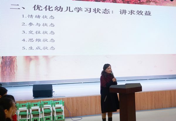 活动分为四大环节:经验交流,教学展示,互动点评,专业总结。湖北省省直机关第三幼儿园的《点亮文化之旅》,江岸区珞珈幼儿园的《发挥管理引领机制、推进园本教研实效》,湖北省省直机关第一幼儿园的《做有问题的教研》分别从教研团队、教研实效、教研选题三个维度对园本教研进行了深入的剖析,引发了到会的园长、教师们的思考。青山区第二幼儿园张凝老师、江岸区珞珈幼儿园叶凯老师分别现场展示了中班语言活动《谁是配音王》、大班语言活动《朋友的来信》,两位执教教师并做了现场活动反思。展示的两节优质活动设计巧妙、过程游戏化、注重精讲多练等优点,获得了现场观摩老师的一致好评,起到了良好的引领示范作用。