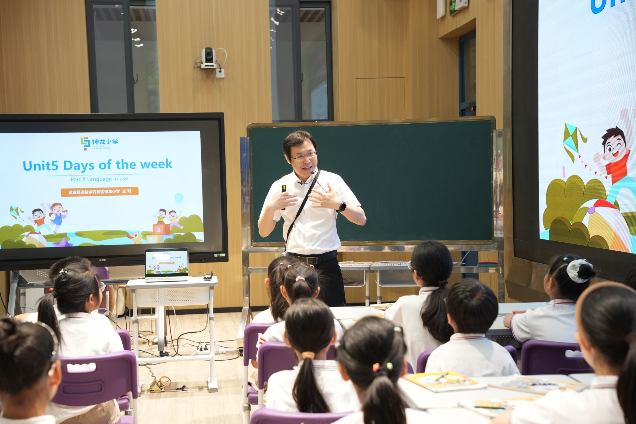 武汉市经开区神龙小学副校长王可执教的《Unit5 Days of the week: Language in use》以独创的AI智能体英语学习助手 “龙龙”贯穿课堂始终,通过实时对话、任务示范等激发学生互动兴趣,构建个性化语言学习路径,充分体现了智能技术对英语课堂教学的创新赋能。课程最后依托学校真实生活设计小组实践活动,引导学生借助AI智能平台、以多元形式介绍 “自己喜爱的一天”,展现个性化学习成果,并运用AI技术进行智能化和个性化的评价。在学习过程中,还巧妙融入武术、象棋、烹饪等中国传统文化元素,以文化浸润的方式潜移默化地实现价值引领,实现语言能力与文化认同的双重提升。