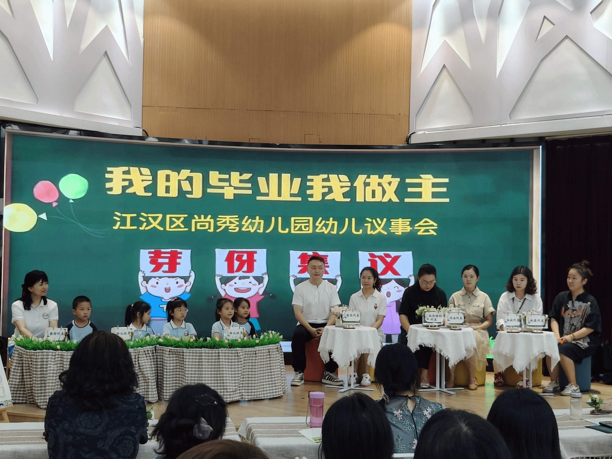 “芽伢集议” 儿童议事厅环节成为本场活动最大亮点,大中班幼儿就 “毕业典礼怎么过” 与家长、社区、司法代表共商共议,用稚嫩却坚定的声音诠释成长主动权。