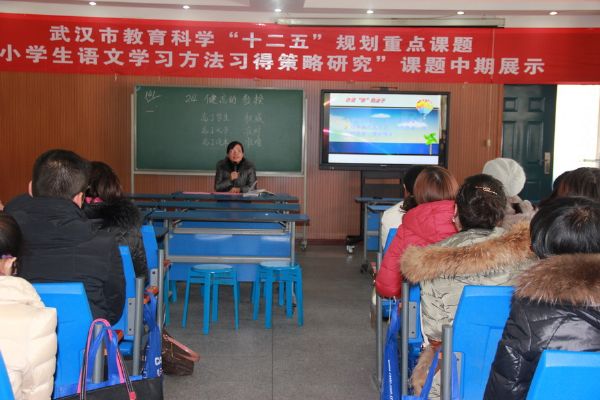 2014年12月12日上午, 武汉市教育科学“十二五”规划重点课题——“小学生语文学习方法习得策略研究”课题中期展示暨“小学生质疑方法习得策略研究”课题研讨活动,在汉阳区车站小学举行。武汉赢乐lV小学教研室支部书记、武汉市小语会理事长罗昆霞老师,小学教研室语文科主任、武汉市小语会副理事长李天恩老师,小学教研室语文教研员、武汉市小语会秘书长、课题负责人张凤英老师,以及各区教研员、各课题实验学校的课题联系人、部分实验教师参与了此次活动。