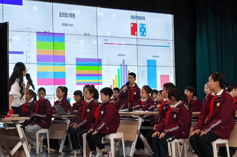 首先,光谷十五小宋欣老师带领五年级的学生上了一堂人教版五年级上册《掷一掷》示范课。宋欣老师在教学中创新融合AI技术,借助DeepSeek设计的小程序模拟掷骰子游戏、精准记录实验结果,再通过光谷十五小数字人“科科”对小程序收集的数据进行智能化整理、分析与直观图表呈现,告别了纸质记录的繁琐与偏差。学生们围着屏幕热烈讨论,在趣味互动中悄然提升了数据意识。