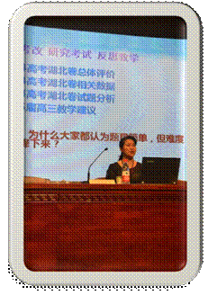 湖北省武昌实验中学的陈克宏老师作了题为“2015届年9月新高三起点调考试卷分析及后期复习建议”的报告;黄陂区教研室彭支乔老师作了“研究考试 反思教学 对路得法”报告;最后,肖胜兰老师作了“2014年高考分析&2015届教学建议”的主题报告。