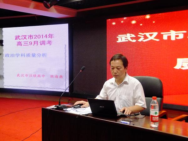 武汉市汉铁高中高三政治备课组长熊海燕老师对武汉市2014年高三9月调考政治学科进行了质量分析,他从试卷命题的角度讲解了试卷基本结构,结合江岸区阅卷情况,通过相关数据对学生答题情况进行了分析。熊老师就重点失分试题、失分原因进行了分析,与会的全市高三政治教师认真聆听了此次质量分析会。