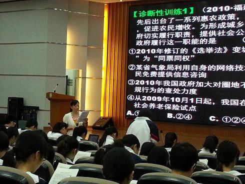本次活动首先由市十二中的姜义芳老师上了一堂政治生活的复习展示课。整堂课分为“知识建构”和“调用知识”两个阶段,重点在“知识建构”上。为帮助学生更好的落实知识,姜老师采用多种方式,有自主学习的“知识梳理”,有“诊断性训练”,有“针对性训练”,有“知识拓展”,有“知识整合”,也有解题技巧与方法的训练与总结。课堂上,师生互动频繁,气氛活跃,得到了与会老师的好评。