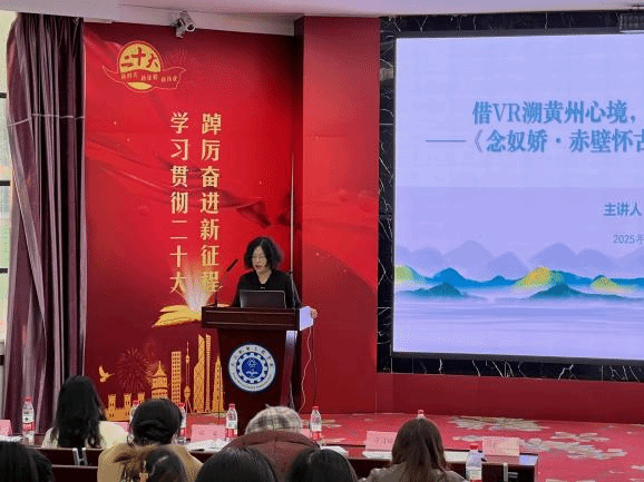 随后,两节精心准备、内容丰富的优质课例依次进行展示。武汉机电工程学校教师李治澄带来了“《念奴娇·赤壁怀古》‘人生如梦’探究课”,以“借VR溯黄州心境,以旷达破人生迷思”为主线,创新运用“AI+VR”技术,构建沉浸式学习场景。学生通过AI与“苏轼”智能对话、VR体验黄州生活场景,深入理解苏轼“人生如梦”的情感层次与旷达精神。课堂设计层层递进,从情境共情到专业迁移,充分体现语文教学工具性与人文性的统一。