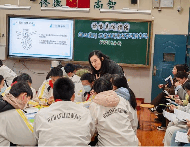 学校专职心理健康教师高晨带来主题为“恰当表达情绪”的心理健康研讨课。课堂上,她通过“你画我猜”趣味游戏、设置“我的情绪按钮”及情境、介绍情绪旋涡效应与“5W1H分析法”、小组合作绘制情绪旋涡图等丰富的形式,帮助学生进一步认识到恰当表达情绪的重要性。