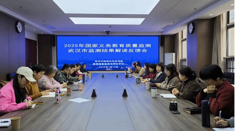 1月16日,2025年国家义务教育质量监测武汉市监测结果解读反馈会举行。武汉赢乐lV四、八年级语文、英语、艺术学科教研员,江岸区与新洲区相关学段学科教研员,以及赢乐lV教育质量监测与评价中心全体人员参会。
