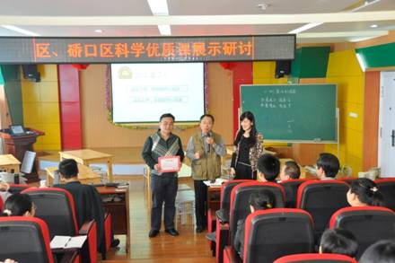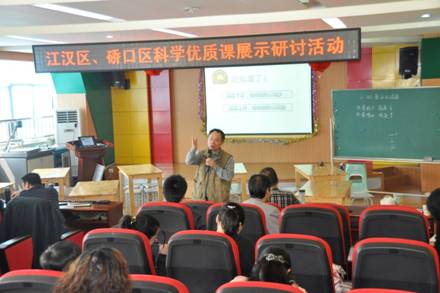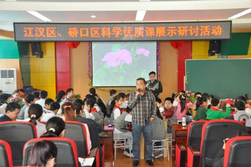 第四:嘉宾点评。市科学教研员甘金福老师作为与会嘉宾对活动进行了总结。首先,他充分肯定了此次活动的研讨形式,认为这是一次科学研讨领域的强强联手,更是一次科学学术活动的合作共赢。其次,甘老师对两节课进行深入分析,指出两位上课教师对教材的理解和把握比较到位,对学生的关注和发展比较注重;甘老师同时指出了两节课中的不足之处并提出了改进建议。点评结束后,甘老师就后期的科学学科资源共享问题与江汉,硚口的领导,老师进行了磋商与交流,并达成有效共识。