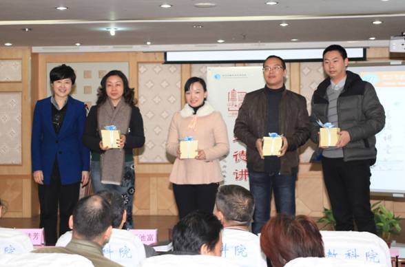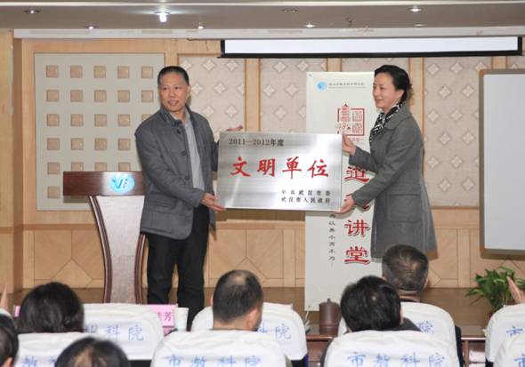 道德讲堂开始前,举行了简短的授牌仪式,硚口区文明办夏主任向我院颁发了2011—2012年度市级文明单位奖牌,对我院积极发挥市级文明单位的作用给予了高度的评价。