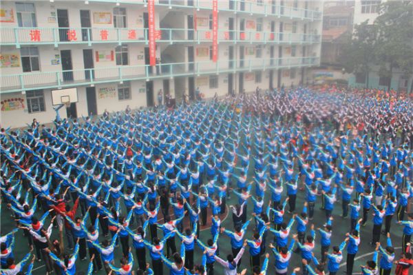 其后,参加活动的领导和来宾观摩了我校大课间校歌和经典诵读展示。