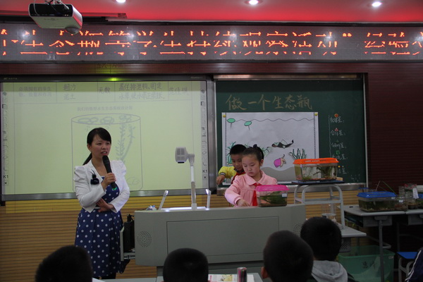 没有花团锦簇,可是整齐码放在会场四周,盛着清水,漾着油绿水草,悠游着甩尾小鱼的生态瓶,让交流会现场映着浓浓的科学气息。交流课上,杨帆老师与孩子们回忆着制作生态瓶的经历,分享着成功的经验,探讨着失败的缘由,欢呼与叹息,掌声与鼓励时时充盈课堂,浓厚的科研氛围犹如金秋的桂香沁润着每一位来宾。