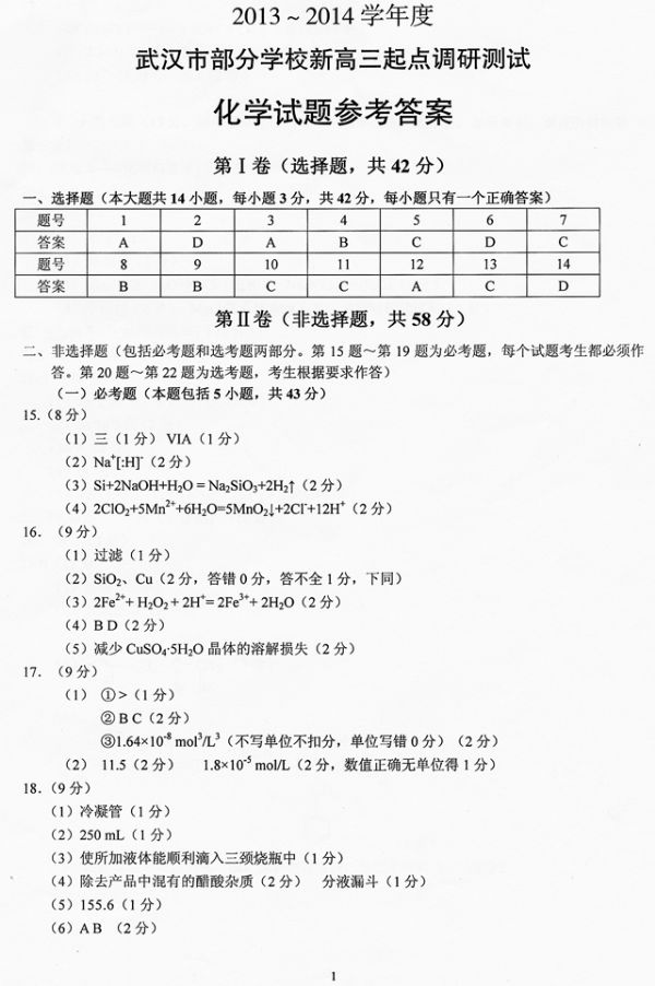 2013-2014学年度武汉市部分学校新高三起点调研测试化学试题参考答案