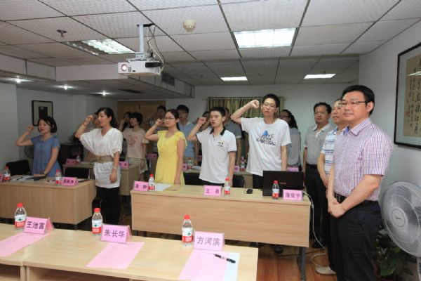 在庄严肃穆的国歌之后,办公室方河滨副主任介绍了我院建立共青团组织工作筹备情况,谢琼副主任宣读了市教育团工委的批复,青年团员们在团旗下重温了入团誓词。