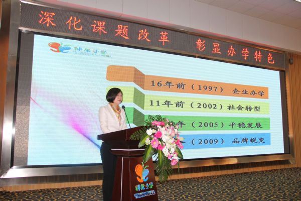 (图3 神龙小学校长韩瑾在会上介绍特色学校形成经验)