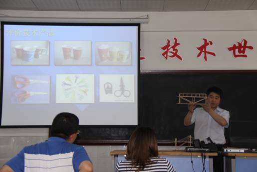 湖大附中林永元老师在进行《简单结构的设计》的说课。手中所持的是学生设计制作的桥梁模型。