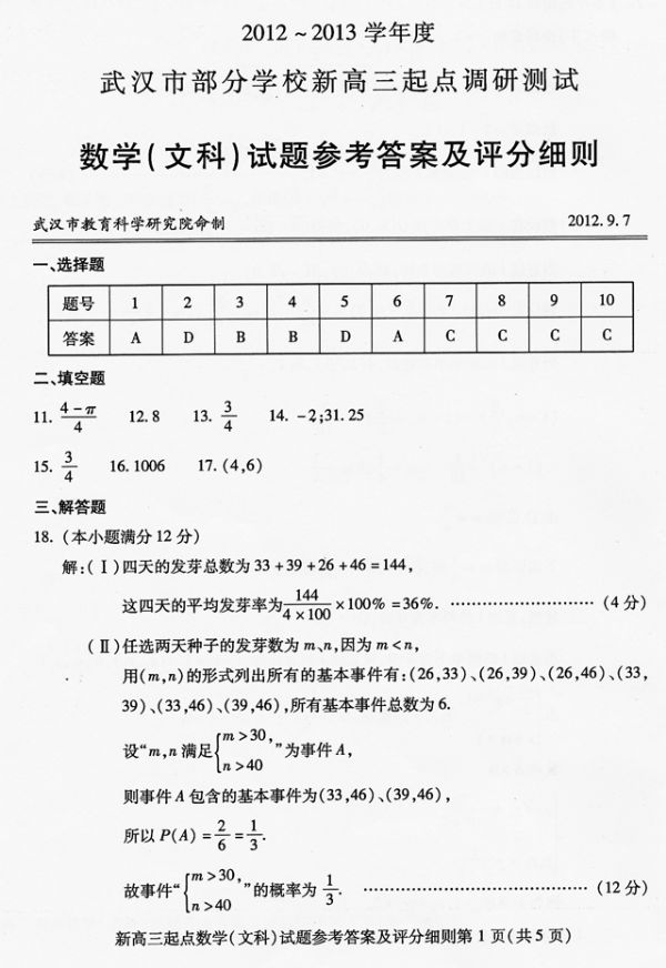 2012-2013学年度武汉市部分学校新高三起点调考数学(文科)参考答案